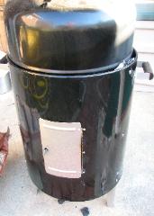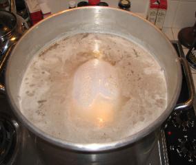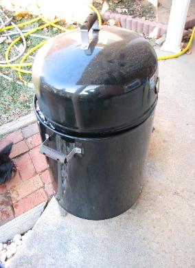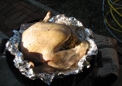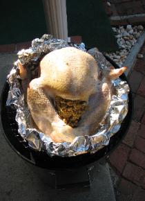 | Smoked Turkey 1 Turkey, whole, gutted hollow 10 feet butcher's twine or string turkey lifter 3 TBLSP Butter 1 TBLSP Pepper, black, coarse ground 1 TBLSP Salt, Kosher 1 cup Salt, table 30 minutes per pound before cooking take pot large enough to hold turkey under water and fill 1/2 full with water. Dissolve salt into water. Place turkey in water until covered, and place overnight in refrigerator Approx. 45 minutes before cook time, remove Turkey from water, and allow it to warm for 30 minutes to room temperature Stuff Turkey with dressing Bind Turkey with twine - legs in particular, and create some sort of harness to allow turkey to be lifted Rub entire outer surface of turkey with butter or olive oil. Sprinkle surface liberally with salt & pepper Place Turkey in smoker |