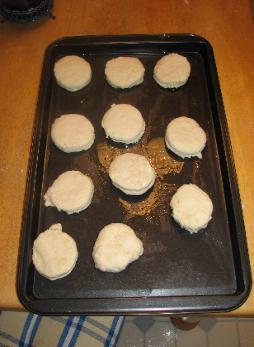 | Biscuits 2 cups flour, all purpose 1 tsp salt 3 tsp baking powder 1 tsp baking soda 5 TBLSP butter, unsalted 7/8 cup plain yogurt Preheat oven to 450`F Mix dry ingredients in a bowl. Cut butter into pieces, and blend into mix by rubbing dry mix between fingers with butter, dropping back into mix when blended. Stir in yogurt until mixture forms a ball. Turn dough out onto large floured surface and kneed 10 times. Press to 3/4" thick. Cut into 2" rounds with open cutter. Bake 7-9 minutes. |