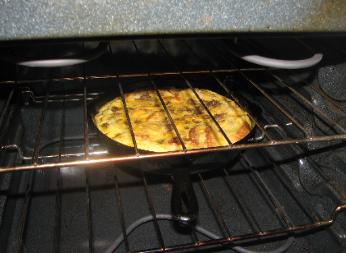 | Egg & Sausage Casserole 1 Skillet, cast iron, well seasoned, large 12 Eggs, very large 1 cup Cheese, cheddar, sharp, shredded 1/2 cup cream, regular or half-n-half 4 bread, slices 1 lb Sausage, Jimmy Dean regular 1 tsp dry mustard Lightly beat eggs and cream in large bowl Add shredded cheese and dry mustard to eggs Shred Bread into large (1-2 in.) chunks, add bread to egg mixture, set aside Brown sausage in large skillet, crumbling as it cooks. When browned, add egg mixture to skillet. Stir lightly to mix sausage with eggs Place skillet into 375`F preheated oven Bake until firm throughout, about 15 minutes Remove from oven and allow to sit, covered with cloth, for 10 minutes |
