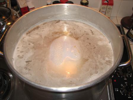 Brining the noble bird for Thanksgiving - it is floating here because it makes for a better picture, but in real application you want to get all the air out of the body cavity and keep your bird submerged.
