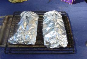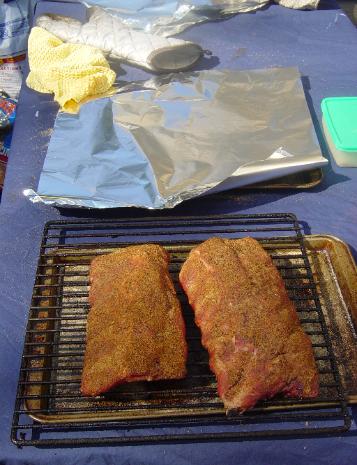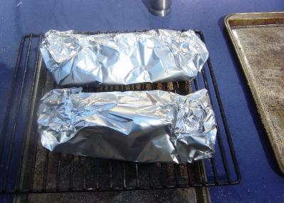 Wrapped and Ready A Butt roast (left) and a rack of baby back ribs (right) get ready to smoke in their juices!